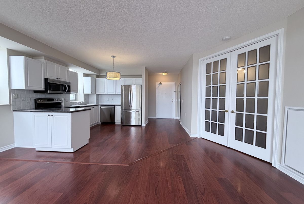 Welcome to a stunning, immaculate, and spacious open-concept 2-bedroom, 2-bathroom corner unit with panoramic views in the heart of Mississauga. Freshly painted. This bright home features a modern kitchen with sought-after windows and a movable island. The living and dining area boasts floor-to-ceiling windows and a Juliet balcony overlooking an unobstructed cityscape-no blocked views. With no carpets throughout, the home is both stylish and easy to maintain. Ideally located close to parks, ravines, Square One, highways, theatre, dining, and schools. All utilities are included in the condo fees.