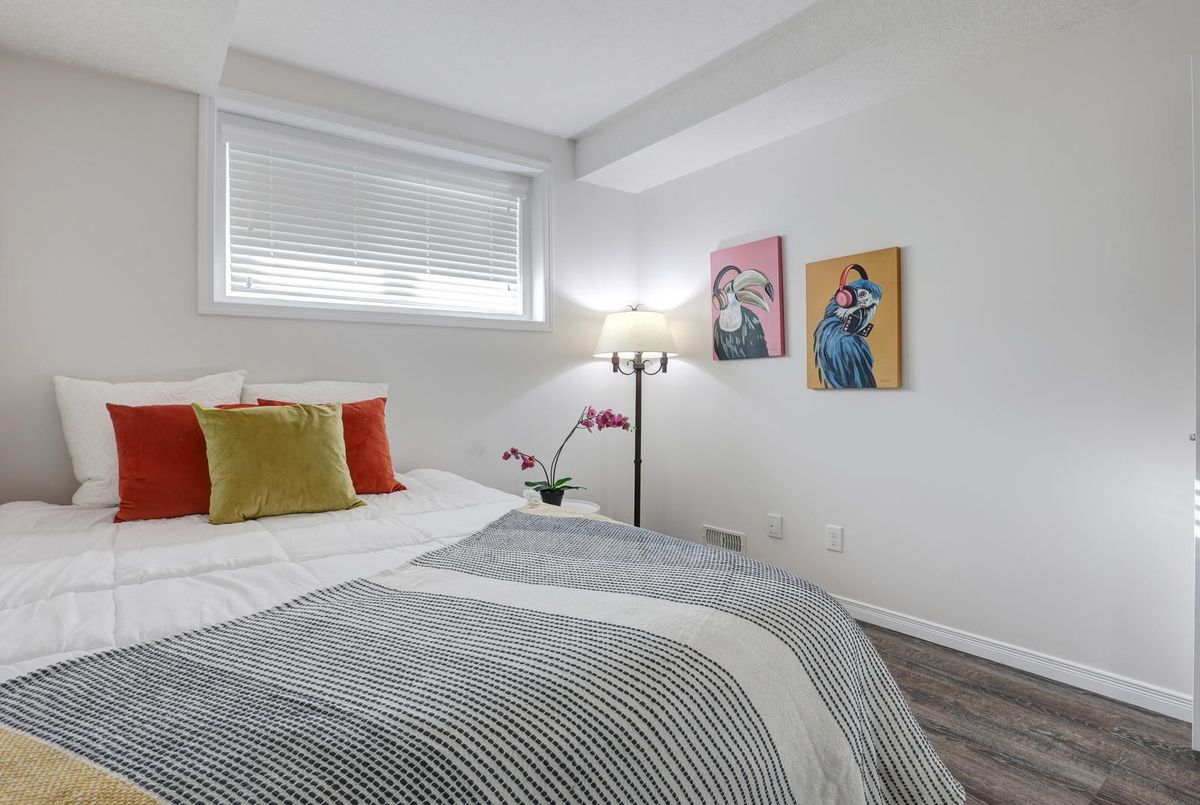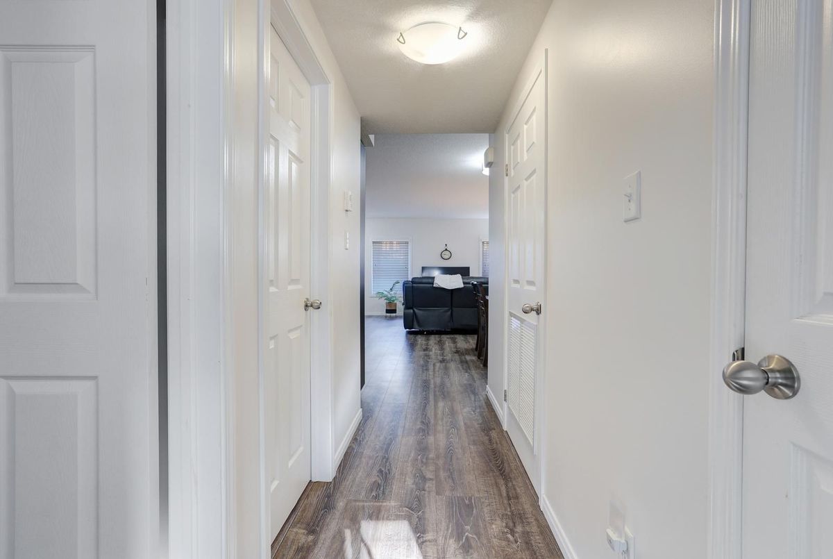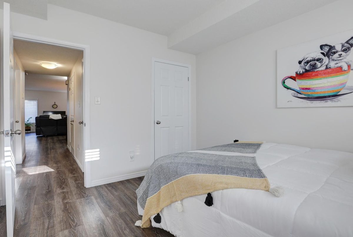 Welcome to this gorgeous stacked townhouse condo offering the perfect blend of comfort, convenience, and modern design! This beautifully maintained 2-bedroom, 1-bathroom unit features an open-concept layout with carpet-free living, neutral tones, and a bright, inviting atmosphere. The modern kitchen is a showstopper-complete with stainless steel appliances, stylish cabinetry, a large island with breakfast bar, ample storage, and sleek finishes. The spacious living and dining area make entertaining a breeze, while the private covered front patio offers a peaceful outdoor retreat. Both bedrooms are generous in size, including a large primary with great closet space. Enjoy the convenience of in-suite laundry, a large walk-in front storage closet, and an additional utility room for even more storage options. Recent updates include fresh paint throughout and upgraded lighting. Perfectly located in highly sought-after Laurentian West, this home is just minutes from The Boardwalk, Sunrise Shopping Centre with superstores like Walmart, Canadian Tire, Home Depot and more, as well as schools, parks, trails, playgrounds, and quick access to Hwy 7/8/401. The well-kept complex features visitor parking and a private playground, making it ideal for first-time buyers, downsizers, or investors seeking a move-in-ready home in a fantastic location. With parking right in front of your unit, a quiet community setting, and close proximity to everything you need, this stylish condo truly checks all the boxes. Move right in and start enjoying modern living at its best-this is the one you've been waiting for!